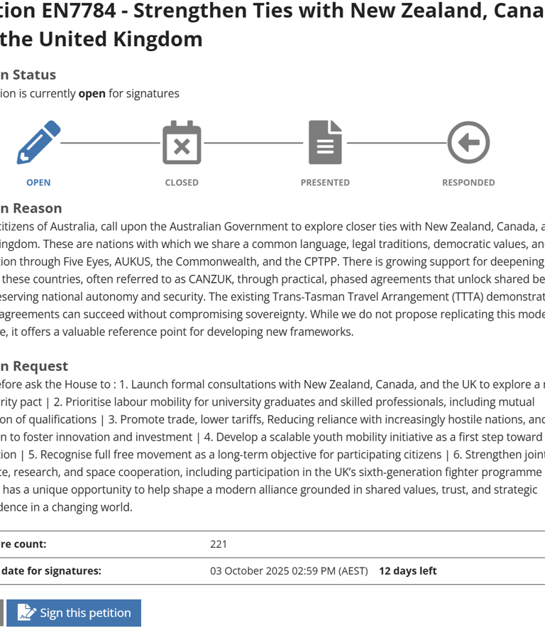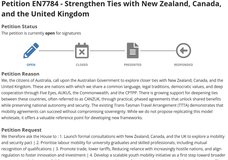 This Petitions outlines the first steps we believe the governments will have to take to get to CANZUK.